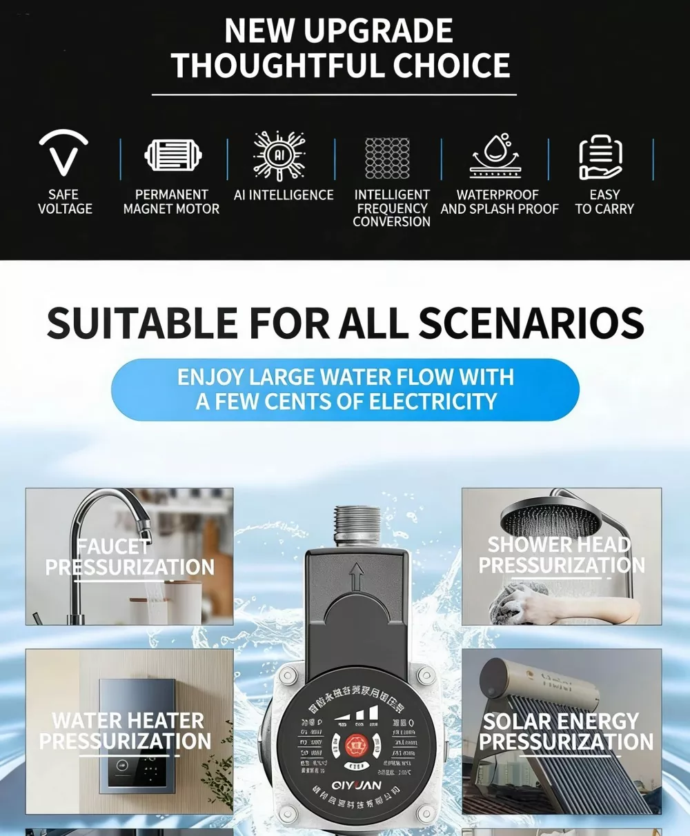 ปั๊มเพิ่มแรงดันน้ำแบบแม่เหล็กถาวรแบบแปรผันอัจฉริยะพร้อมเทคโนโลยีความถี่แบบแม่เหล็กถาวรแบบมืออาชีพ มอบโซลูชันการเพิ่มแรงดันที่เสถียร มีประสิทธิภาพ และเงียบสำหรับการใช้น้ำในครัวเรือน แก้ปัญหาปัญหาแรงดันน้ำในครัวเรือนไม่เพียงพออย่างครอบคลุม